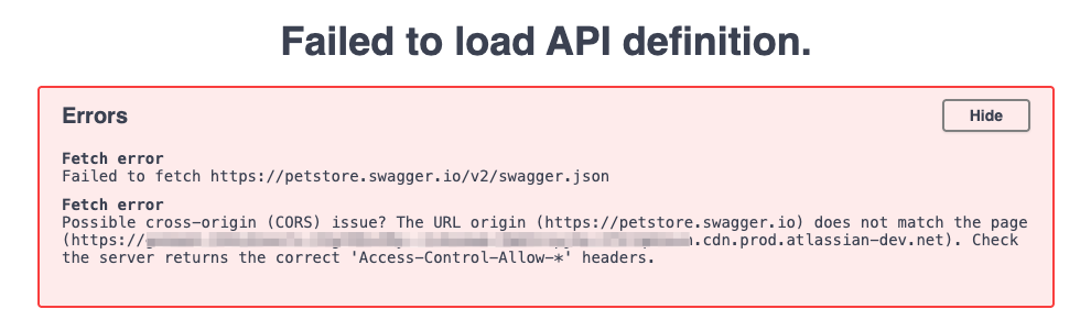 The above error indicates that Javascript loaded from *.cdn.prod.atlassian-dev.net (the app) attempted to fetch a JSON file from petstore.swagger.io but was prevented due to missing CORS headers.